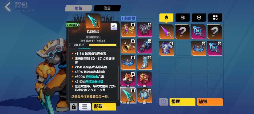临别所求9.23更新加强了连续攻击600%,配合召唤的同构武装天赋,简直不谈了,不过腰带得找一个召唤守卫核心的无限,这个比较麻烦,有的话直接起飞