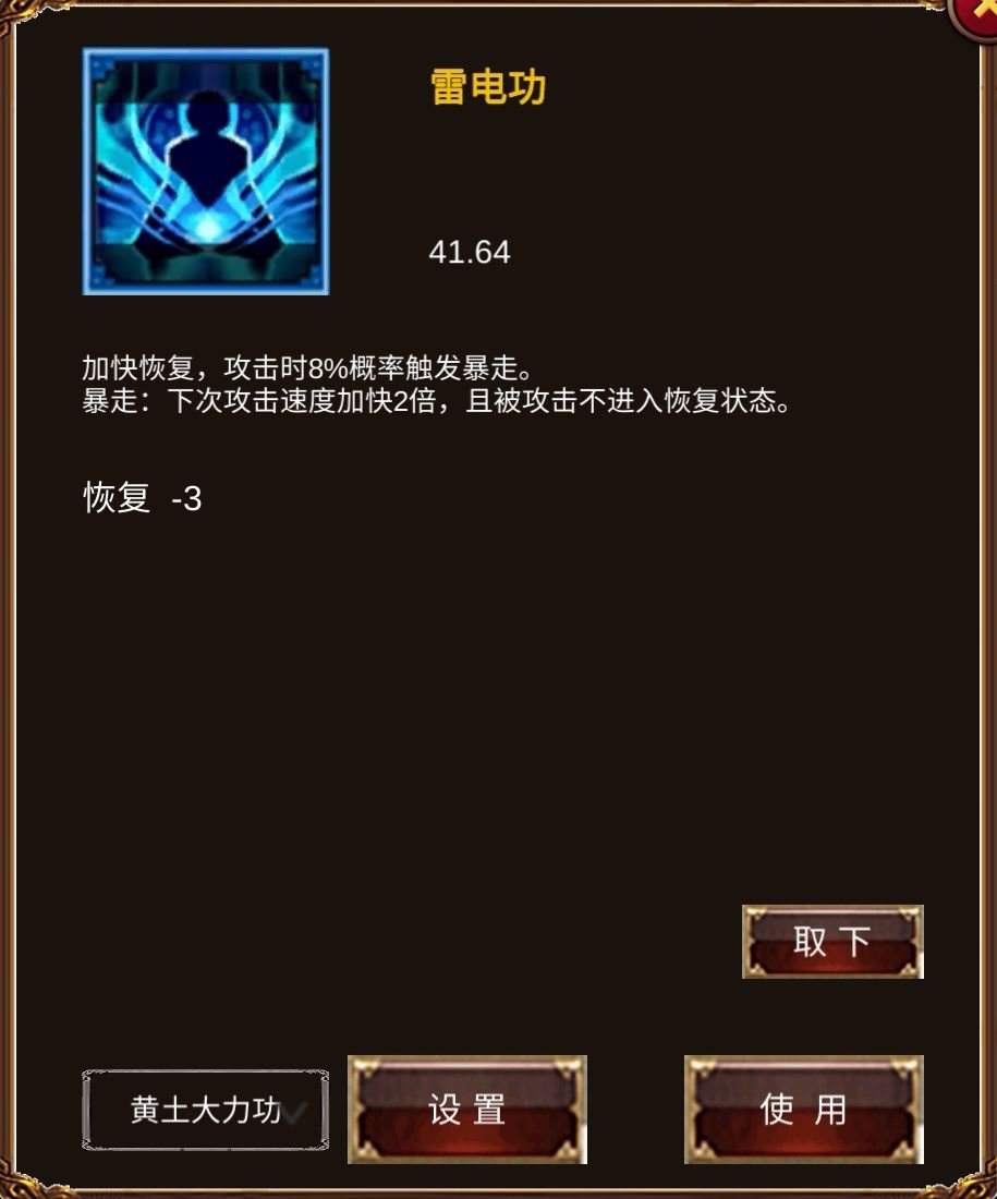 几率触发多打一次,虽然没暴击黄色数字好看,多打一次就是加快练武功效率,经验越高触发概率越高,我感觉这心法应该要优先满的。雷电功适合恢复慢的武器,毕竟被动-3恢复。