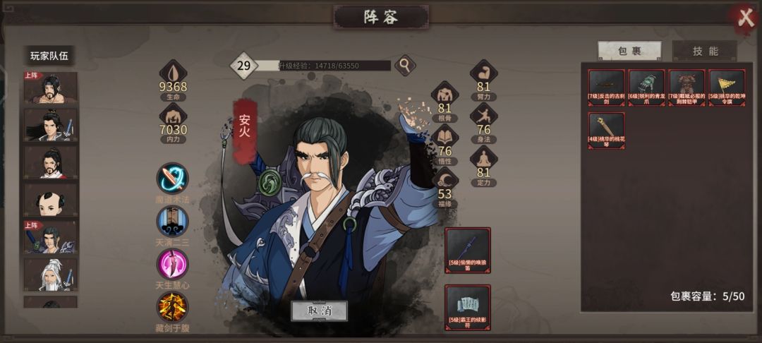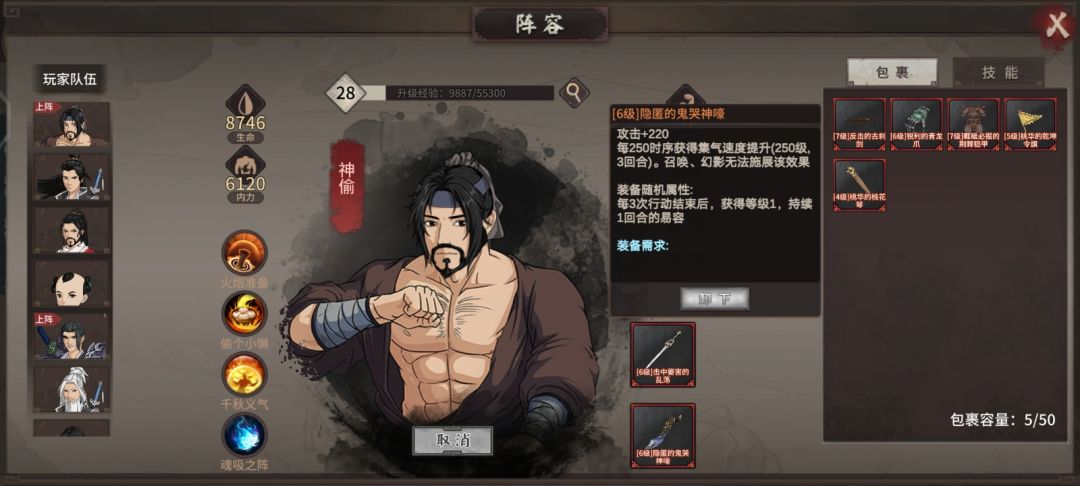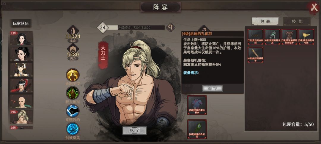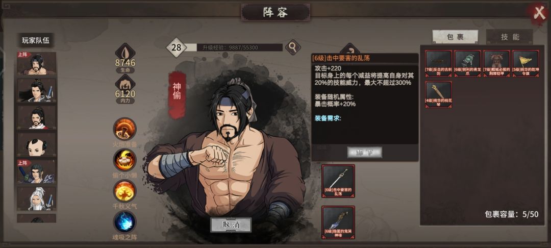 前期跟着主线和支线走一直到15级之前能入队上阵的侠客有小白、刘和琅、陈虚元和大力士,这时候除了主角和大力士必须上阵其他两个随意搭配,武学心法和装备也随意一直过度到15级神偷入队可以换下其他两个其中一个,这时候少林寺和神秘地宫也开放了,真正肝的时候到了