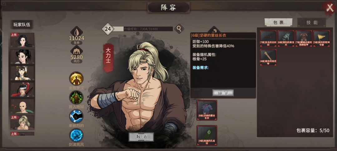 然后就是大力士生命和根骨都是极, 天赋援护75%概率为周围2格内我方角色挡刀这时候再用在少林寺和神秘地宫刷到的金刚罗汉+我入地狱然后搭配个自带技能来碗烈的+剑波岚风(也是少林寺和神秘地宫出残页),金刚罗汉是伤害减免,我入地狱是加盾和挡刀,来碗烈的为自身增加临时护盾,剑波岚风在100时序内把自身受到的伤害转换为临时护盾,装备用加防御和加生命被击败时防止死亡附带增加奥义概率和根骨的防具