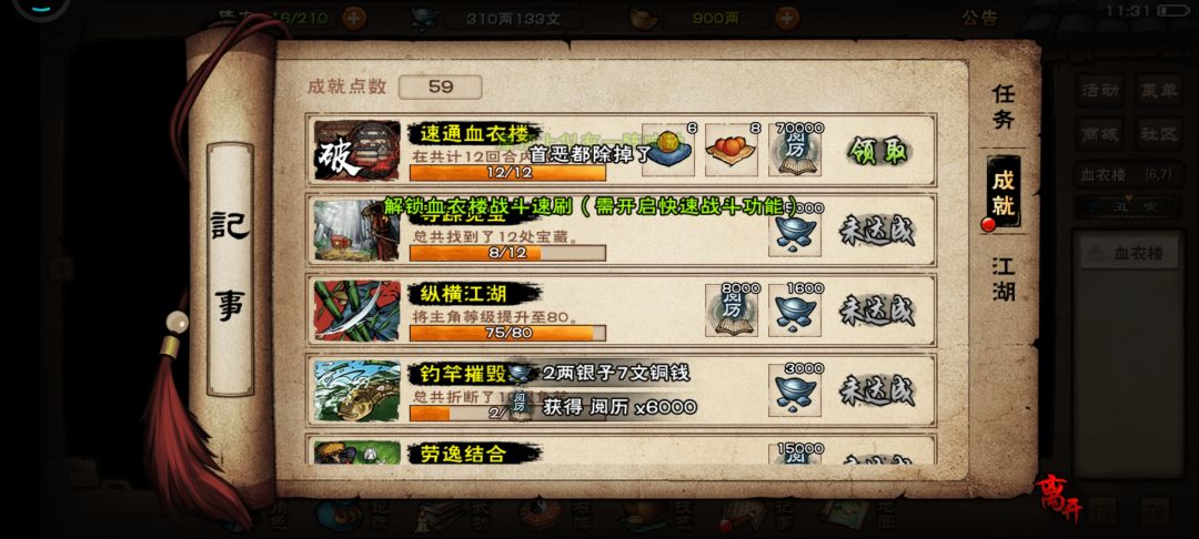 今天刚好攒齐了300银两,所以马上就把12回合血衣楼和秦舞阳打掉了。
