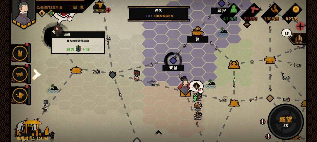 中间等他们行军途中,不停游说晋国加zz名臣好感度。