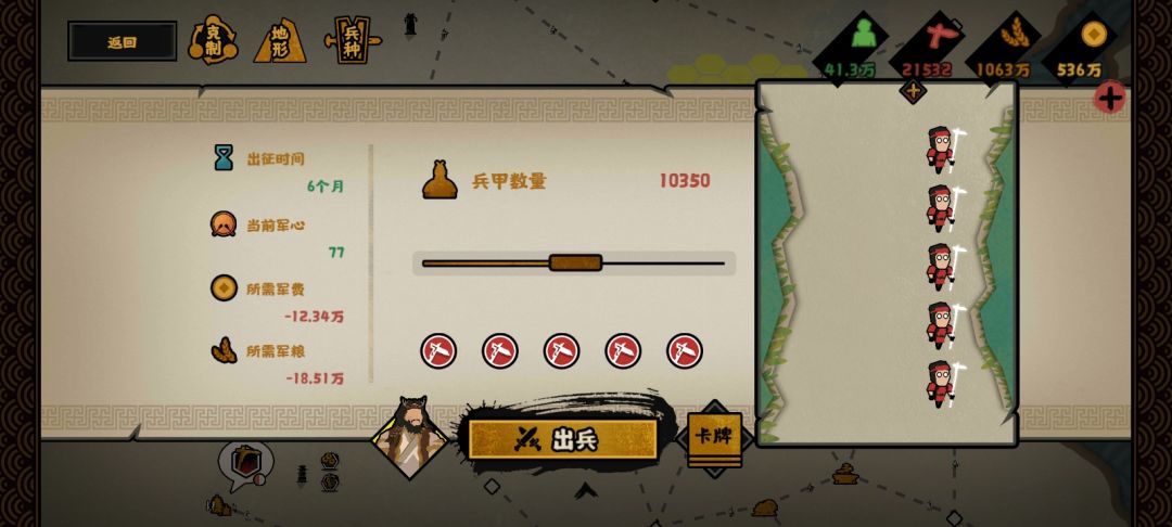 中山打下了之后,半满兵打一下匈奴的一级城,我们让燕国去打下了就行了,不用管。接着,一次性拿下义渠、蜀国,俘虏换钱粮。用冯异一站灭了巴国(累战消耗行动力,但行动力会慢慢恢复,名臣政策也可以加好感度。如果发现后面行动力不够,下次刷建议不要累战了),俘虏充军