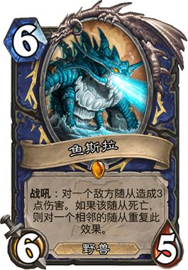 班德斯莫什在出现时并不受萨满玩家喜爱,毕竟长得丑还娱乐,不过在异变萨手中,这张卡确实有极高的强度,为此我也是把他放在了封面上(才没有)。首先随机传说的机制让萨满在有些情况下可以创造奇迹,而555的身材限定就在有时可以让一些费卡焕发青春。比较典型的就是术士手上的蝙蝠之神在班德斯莫什的加成下会变成555铺满场,可以说是相当可怕。大家也肯定在逗鱼时刻上看过那手无限异变老虎,一回合血量拉满。那就是班德斯莫什的功劳了。在最低限度上,它也能提供一个5费的进化素材,它变个高费怪是下下去,再进行进化梦想一波也是有不错的效果的。当然提供一个不错的战吼同时完成站场也是一种玩法,具体的情况还是要看它变什么了。