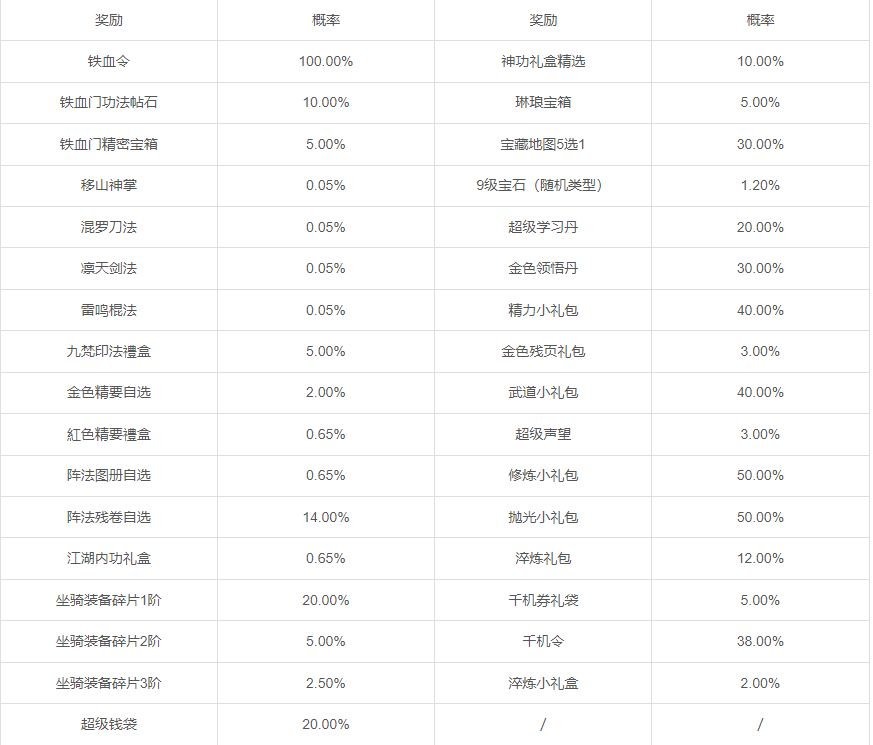 3、玩家通过完成活动任务获取活动经验对铁血武林令“升级”,铁血武林令升级后可以获得奖励;