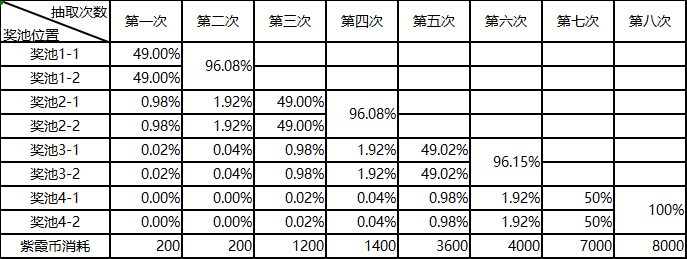 *【概率说明】:此表为默认每次抽到最高概率道具时的概率,如若第一次抽到奖池2-1道具,因抽奖获得道具将不再重复获得,则第二次实际抽奖概率与图中描述第二次概率不同,抽到高奖池道具概率会相应提高。