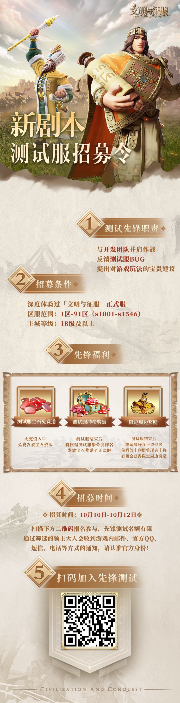 进入「文明与征服」测试服需要下载专属客户端(苹果和安卓用户都可参与测试,苹果用户可用安卓设备或者电脑模拟器下载测试包参与测试体验),领主大大可以超前体验到关于新赛季的重要更新内容,例如:新英雄、新玩法等。