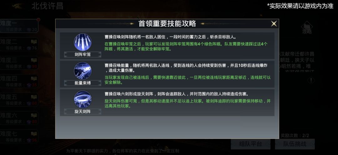 玩法规则:在北伐许昌玩法中,现共分7个难度,击败当前难度的君主后,才能进入下一个关卡。需注意,为平衡天下群雄的实力,各位将军的实力会受到一定压制。具体感受如何,等待正式见面,由将军体验评说。