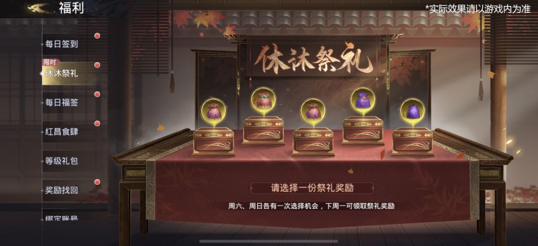 开启时间:每周六、周日各有一次选择奖励的机会,每周可选择两次礼包,在周一领取对应奖励。活动规则:在休沐祭礼玩法中,现有五个礼包供将军选择,领取奖励后可获得所选道具。