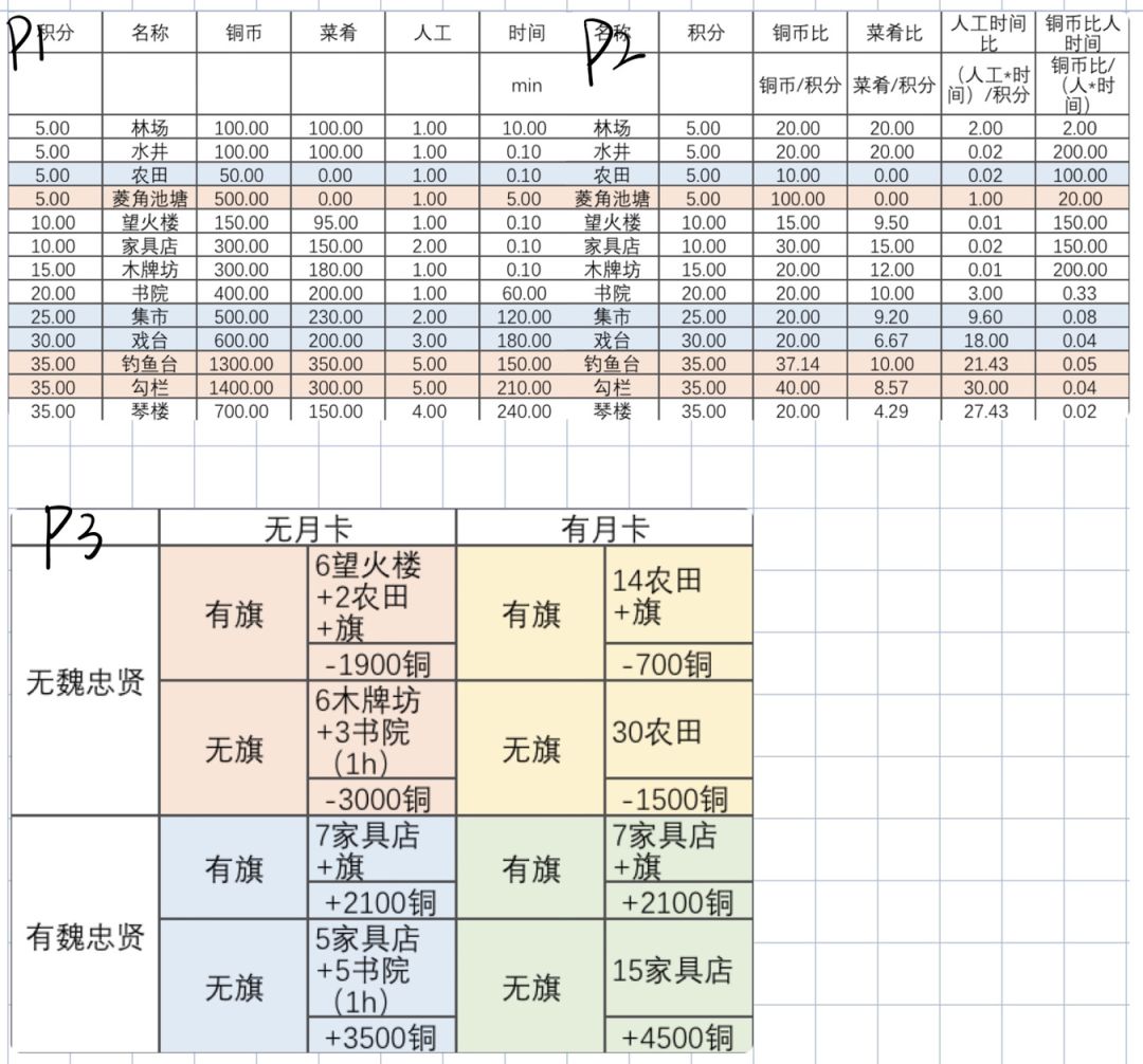 上图的ABC数值,都是越低越好,数值越低就是指每一积分所花费的铜币、菜肴和人时间越少,纵向对比下来,最为划算的是农田,所以在无魏有卡的情况下都建议建造农田来交易