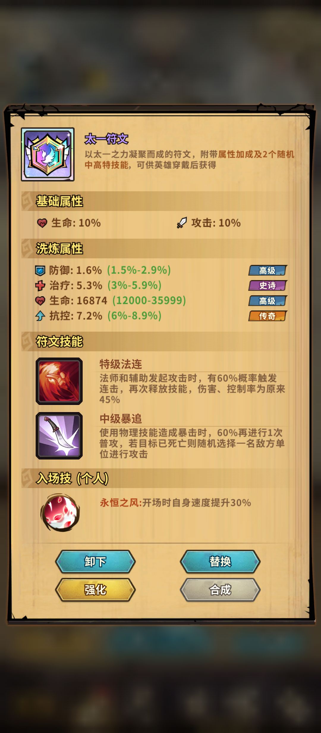 (注:后面这几张图依旧是当前的传说套,还有终极符文(4条属性,天赋入场30%速度提升2回合),4级技能(3个新技:封禁,凝结,反噬))