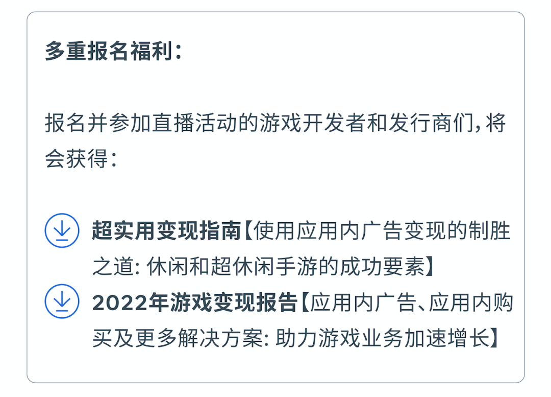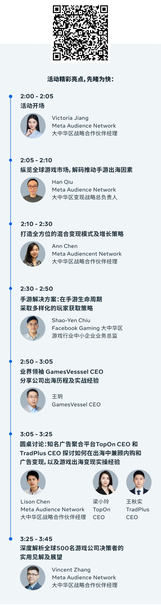 为帮助中国游戏游戏开发者和发行商高效拓展全球业务,Meta Audience Network 携手 Facebook Gaming 团队重磅举行《 2022游戏出海赋能全攻略》线上研讨会。快来扫码报名!