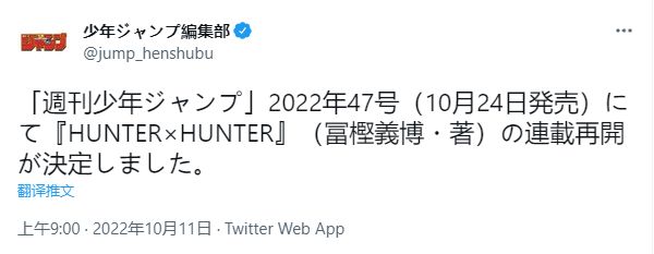 少年jump编辑部官方今日确认由富坚义博著作的《全职猎人》2022年第47期,将于10月24日恢复连载。此外,《全职猎人》第37卷封面一并公开,单行本将于11月4日发售,售价528日元(约合人民币26元)。