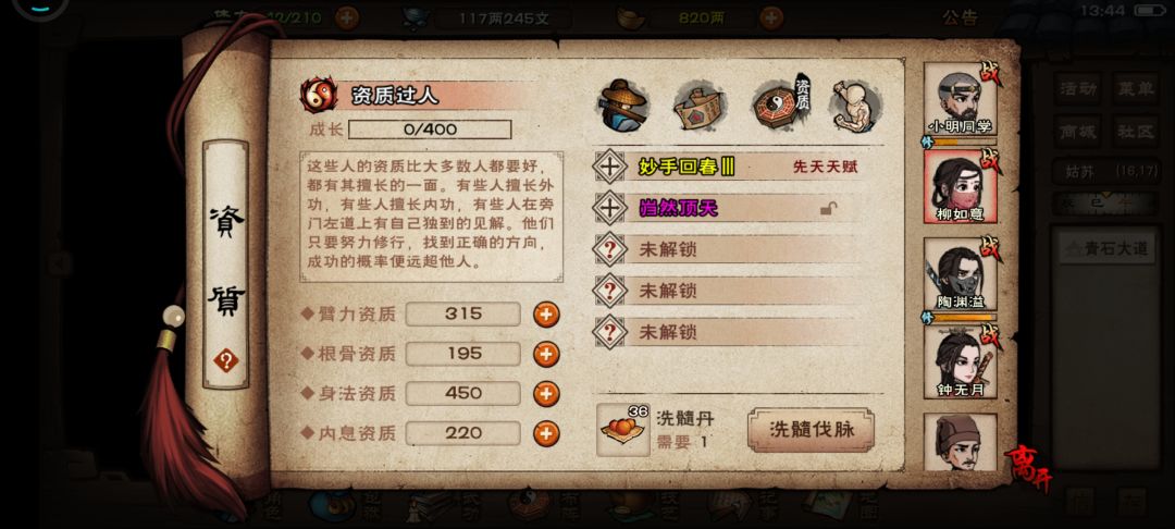 目前想尽一切办法提升队伍强度,通过宝藏也攒了不少洗髓,看了一眼脉序。