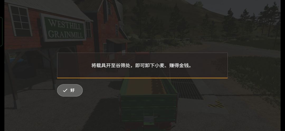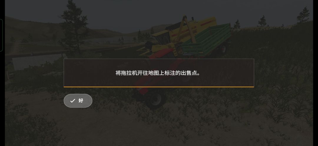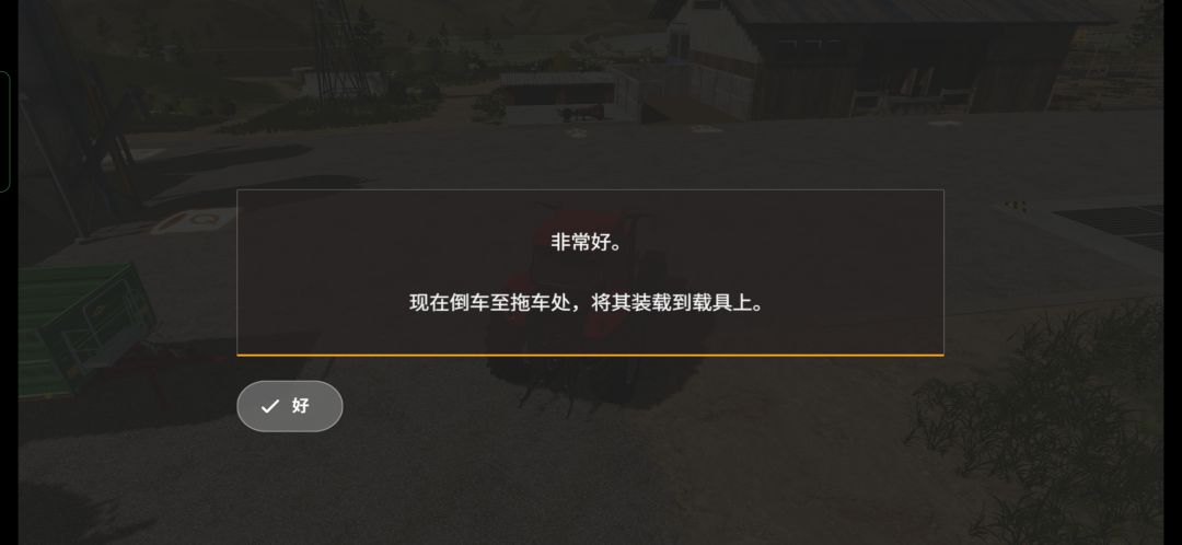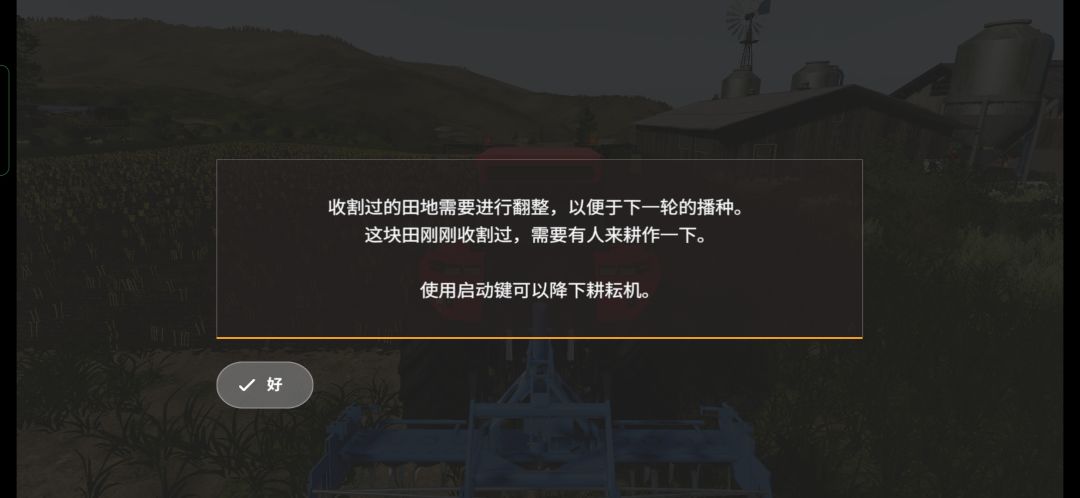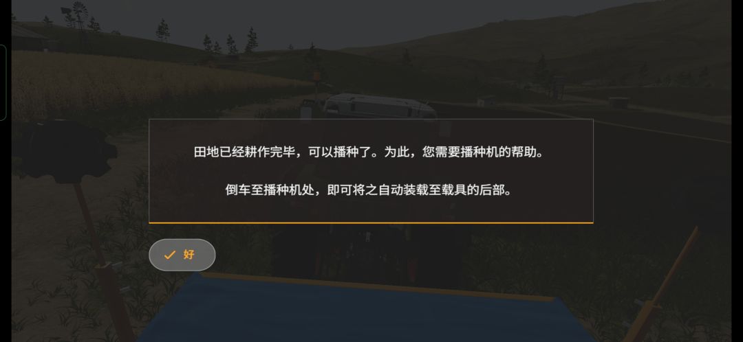 绿色拖拉机是芬特515c,后面有一台播种机,需要玩家自己挂接,操作非常简单,游戏里只需要倒车就可以自动连接了,这里是让玩家熟悉农机的接挂以及播种机的使用,除了部分高端播种机可以实现耕、播、施肥三合一,其他播种机只能在耕好的地上播种,像上面那块茬地,初级的播种机是无法直接作业的。