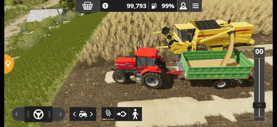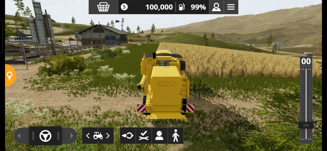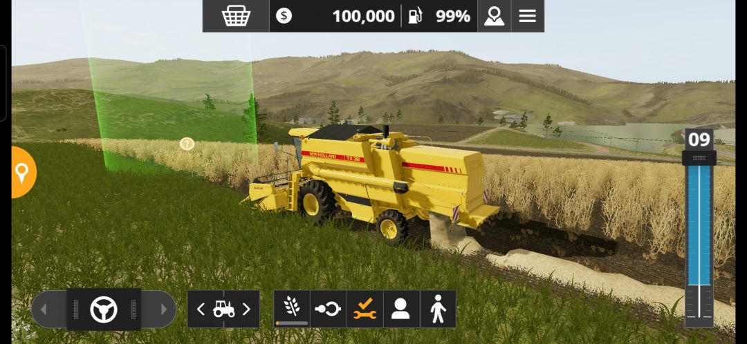 正式进入游戏,眼前就是我们的农场,首先接触到的内容就是“收割”,眼前已经有一片成熟的麦地,以及一台new holland纽荷兰收割机,具体各个图标含义见下图: