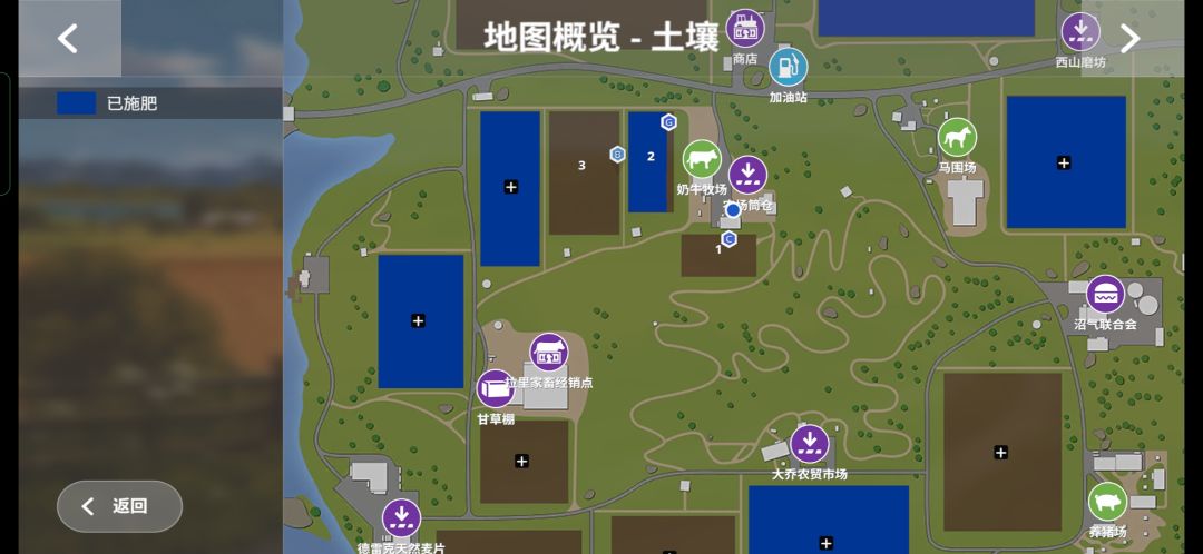 点开大地图我们可以掌握所有农田的状态以及不同农机所在的位置(后期农机数量多了以后靠切换车辆就比较浪费时间了,可以在地图上直接进入选定的载具),点击左右上角的符号切换你要查看的不同信息,包括:作物种类、生长状况、施肥情况、载具位置等。