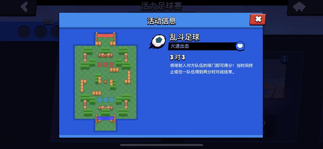 一:活动介绍活动时间:10月9日16:00-10月11日12:00活动模式:三个模式挑战的第三关,活力足球赛开启!3对3的模式,将球射入对方队伍的球门即可得分,当时间终止或任一队伍得到两分时对战结束。负场限制:每次获胜都能赢取超赞奖励!获胜10场即可完成挑战。战败4场则被淘汰出局!二:活动玩法第一阶段-乱斗足球-火速出击
