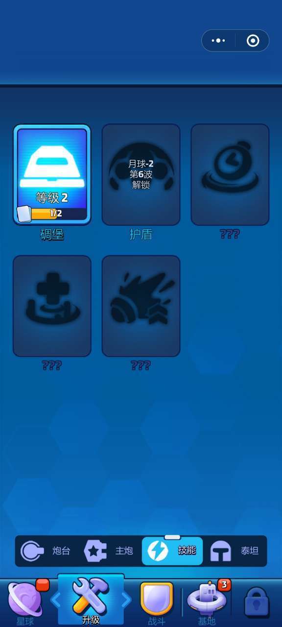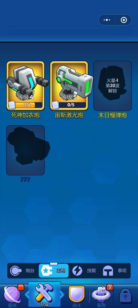 ①从“升级”按钮进入;会显示各位指挥官已经获得的炮台(其中炮台分为单体攻击类、群体攻击类、辅助类三类)主炮,技能和泰坦。