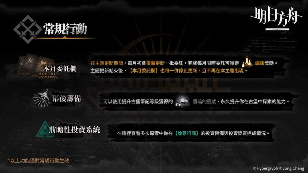 . 「常规行动」获取方式:「探索结束」、解锁「猩红珍藏-长生者宝盒」未知收藏品、完成「本月委托栏」限时委托。