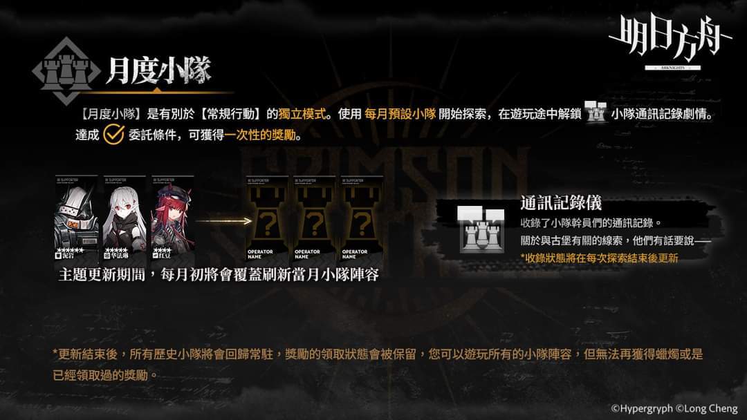 在「傀影与猩红孤钻」集成战略主题更新期间,每月将进行包含【古堡笔记-笔记增页】、【月度小队】、【本月委托栏】的内容更新。