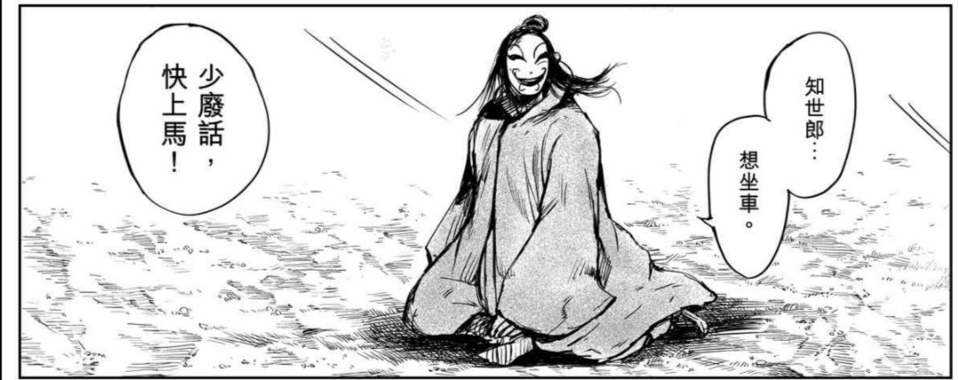 这样一位被认为是孱弱的智者,在漫画中却被许先哲表现的非常鲜活。比如在刀马初见竖要去帮忙打架时,明明该充斥着紧张与危险的气氛,知世郎却依旧可以嚷嚷着说:“知世郎要坐马车”。看着刀马不理他,还可以化作无情的复读机,不停的戳着刀马的后背。