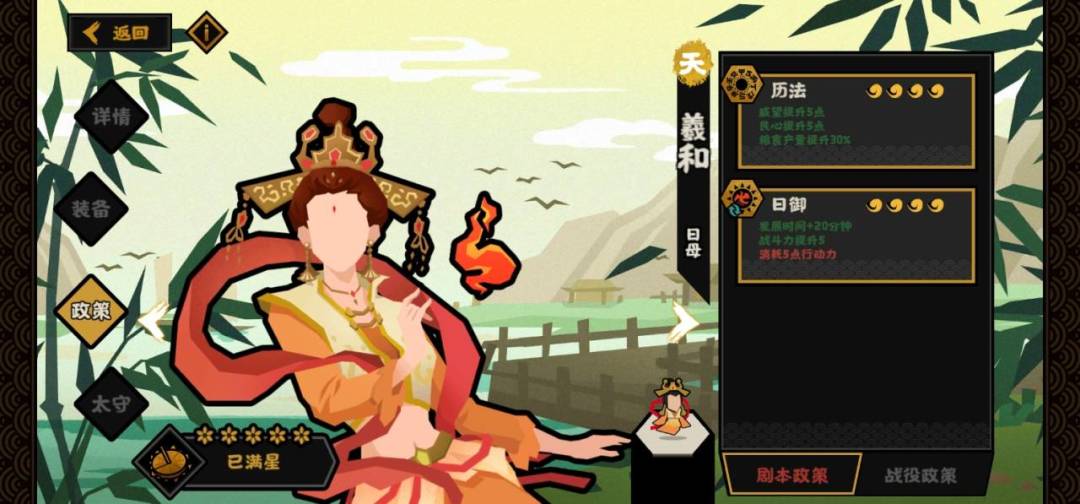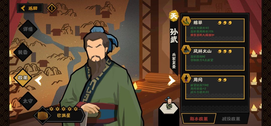 首先具体说说这套阵容的优劣势:他的优势在于前期能给我们提供良好的发育,中期战斗力也不弱,只是相比于其他阵容而言的话,可能中期后期的阵容强势程度有所不足。但这套阵容的优势在于,大部分地图都能用这套阵容来应对。首先开局我们优先羲和1,和管仲1技能来保证我们前期的良好发育,从而不会面临缺资源的问题。其次鬼谷子的1技能,孙武的1、2技能是我们次要的选择。最后当我们发展都一定的程度就可以点完。不多不少正好可以给我们增加100点战斗力,并且因为管仲的存在我们有一张尊王攘夷的卡,这时候我们把政策点的差不多的时候,基本已经能够扫图了。当然这只是相较于大多数地图有些特殊的比如大汉地图我们需要长的时间用来发育,在这里也就不过多的讲解了。上面所述仅代表个人观点,喜欢的小伙伴可以点赞支持谢谢大家