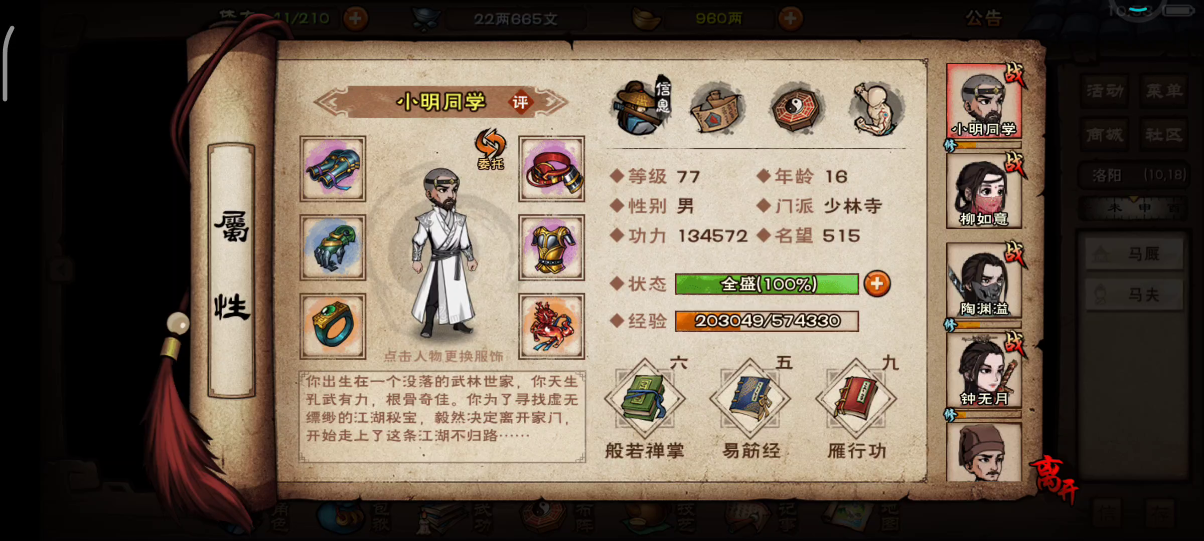 目前:主角般若掌在6升7,明天早上可以到7重,百分比伤害可以弥补一点队伍输出不足的情况。