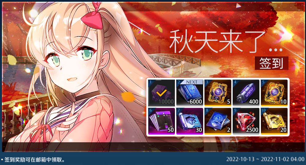 本周四更新维护后,新签到活动“秋天来了”同步上线。签到活动期间内,老板完成登录即可得到包括雇佣契约书、套装二进制、二进制系统、特殊适能核交换券、高级装备材料、能量核、能晶等大量作战资源。活动内容共10日福利,每日首次登录将自动完成签到,届时请老板前往邮箱内领取。