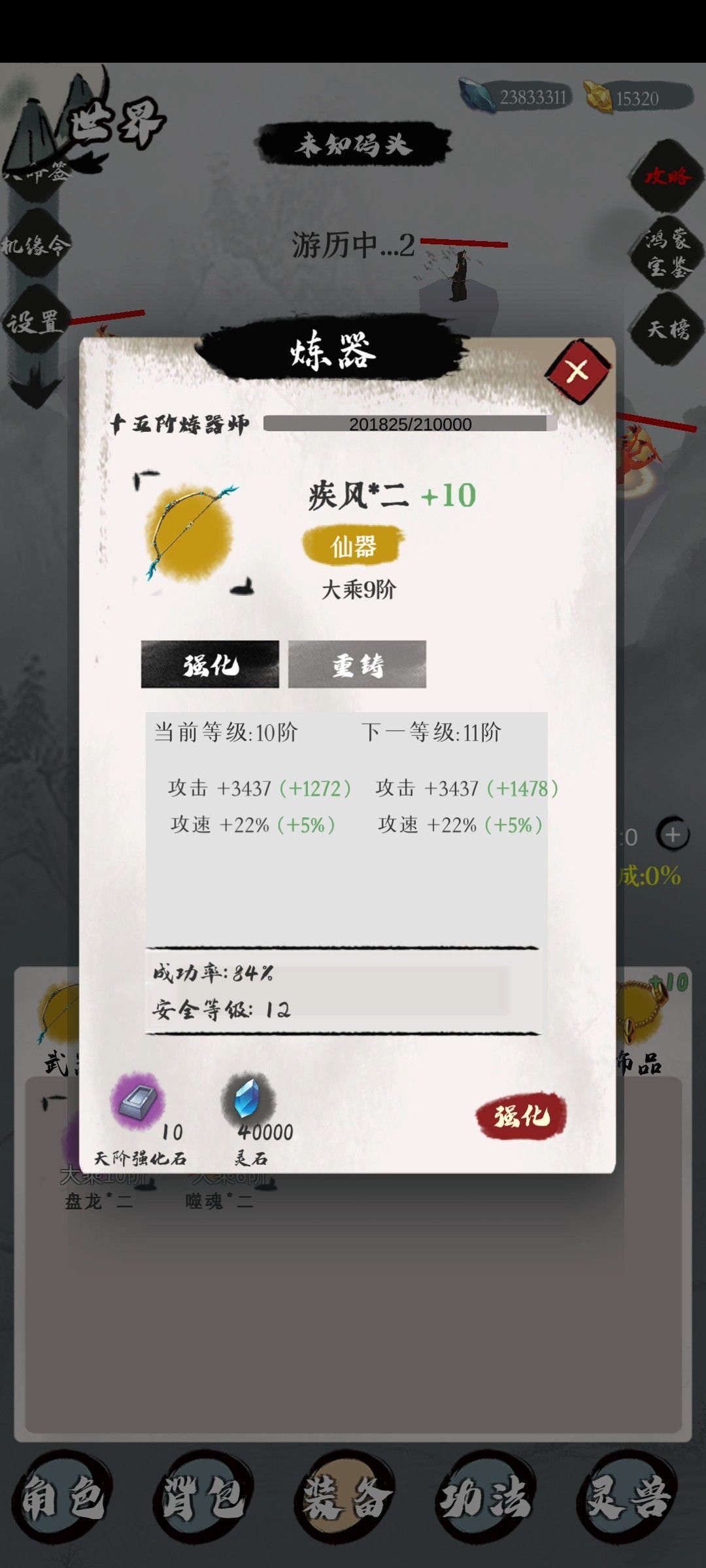 强化装备可以增加经验,经验越高强化几率越高