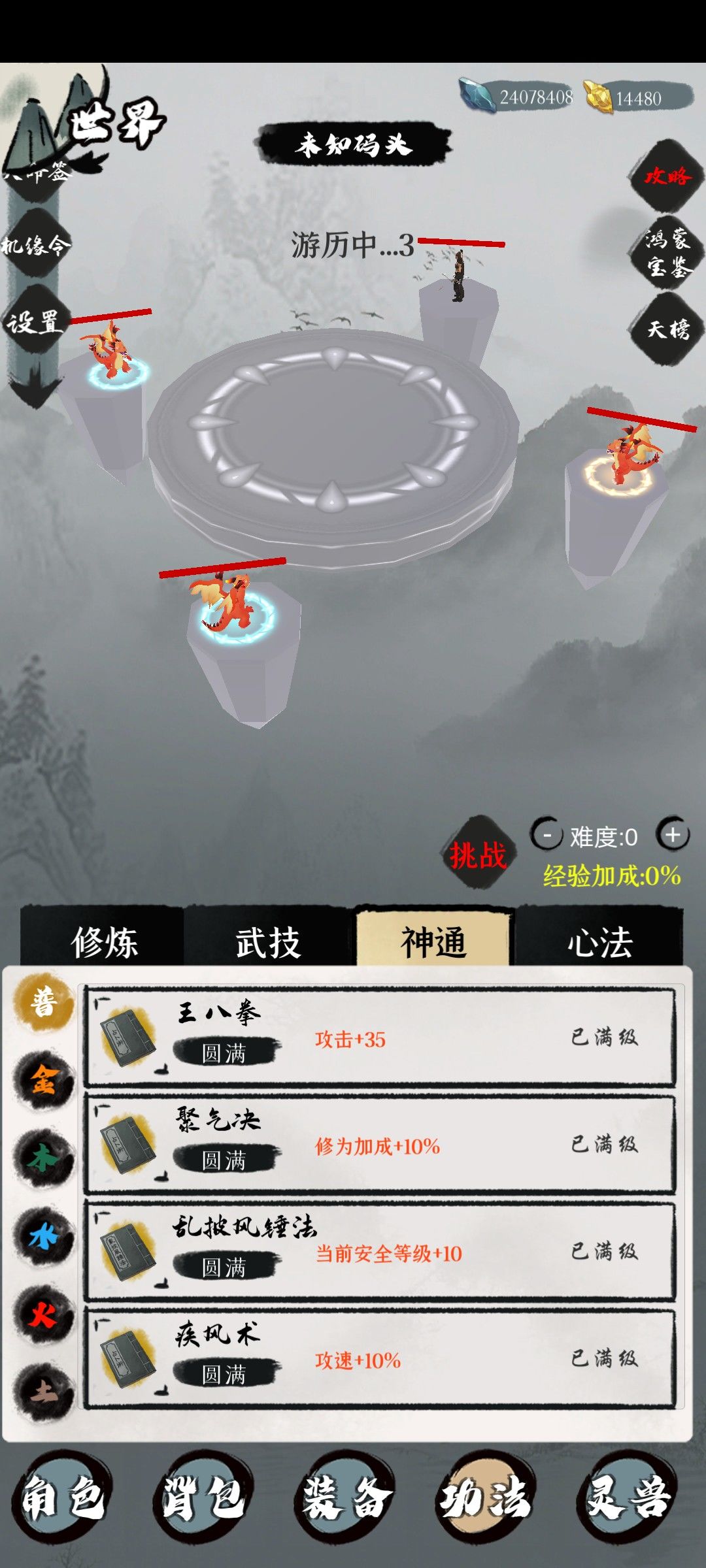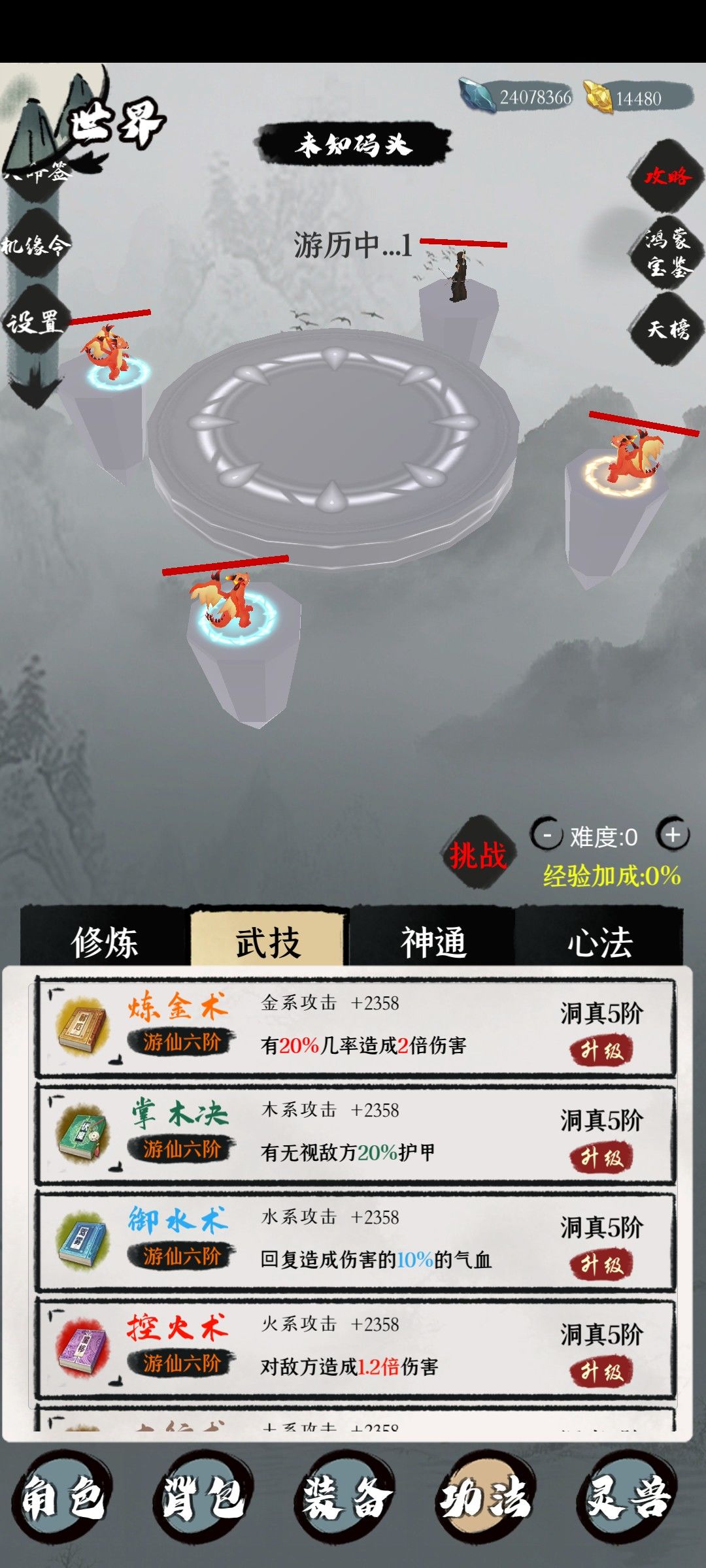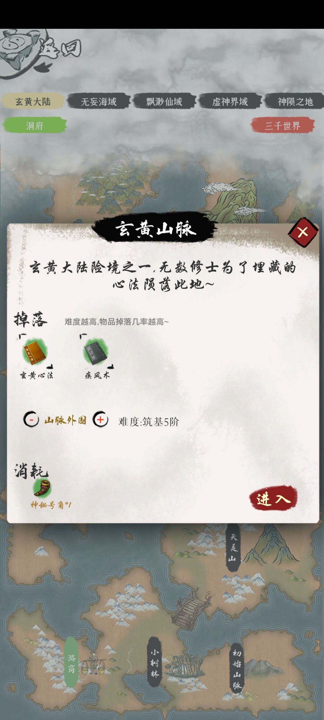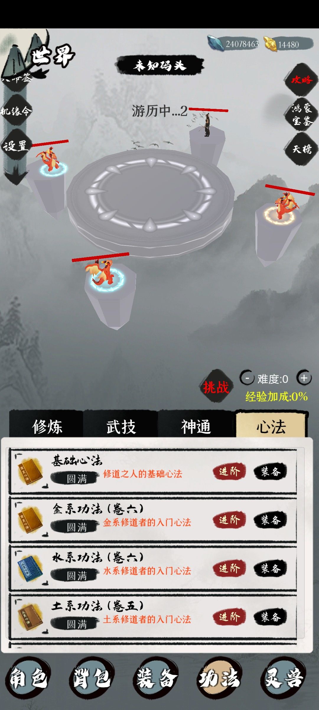 心法可以算成一个主动装备,装备上后加显示属性,固定地图掉落可升级,满级后可以获得神通(3阶心法没有)用更高一级心法进阶