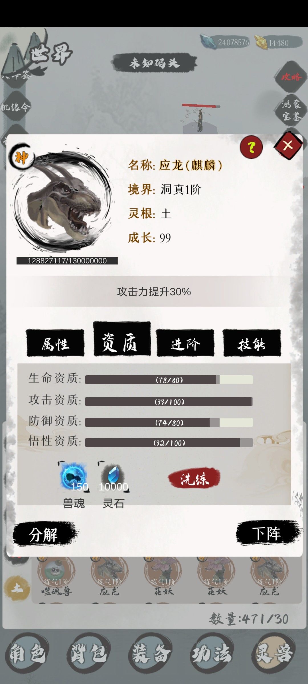 分为妖,魂,灵,仙,神五个品质,宠物强弱跟成长资质(资质可以用兽魂加灵石洗练品质不同消耗不同)有关,每个品质的资质上限不同,所以成长和攻击资质越高越强。