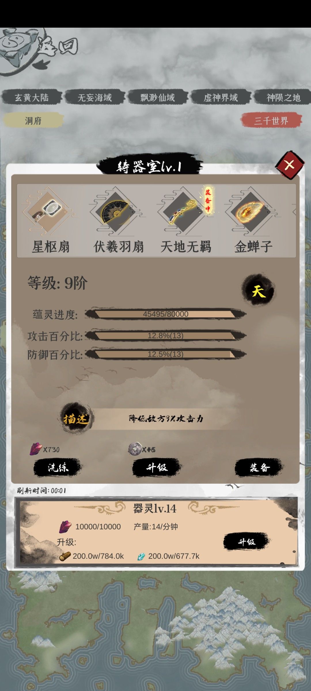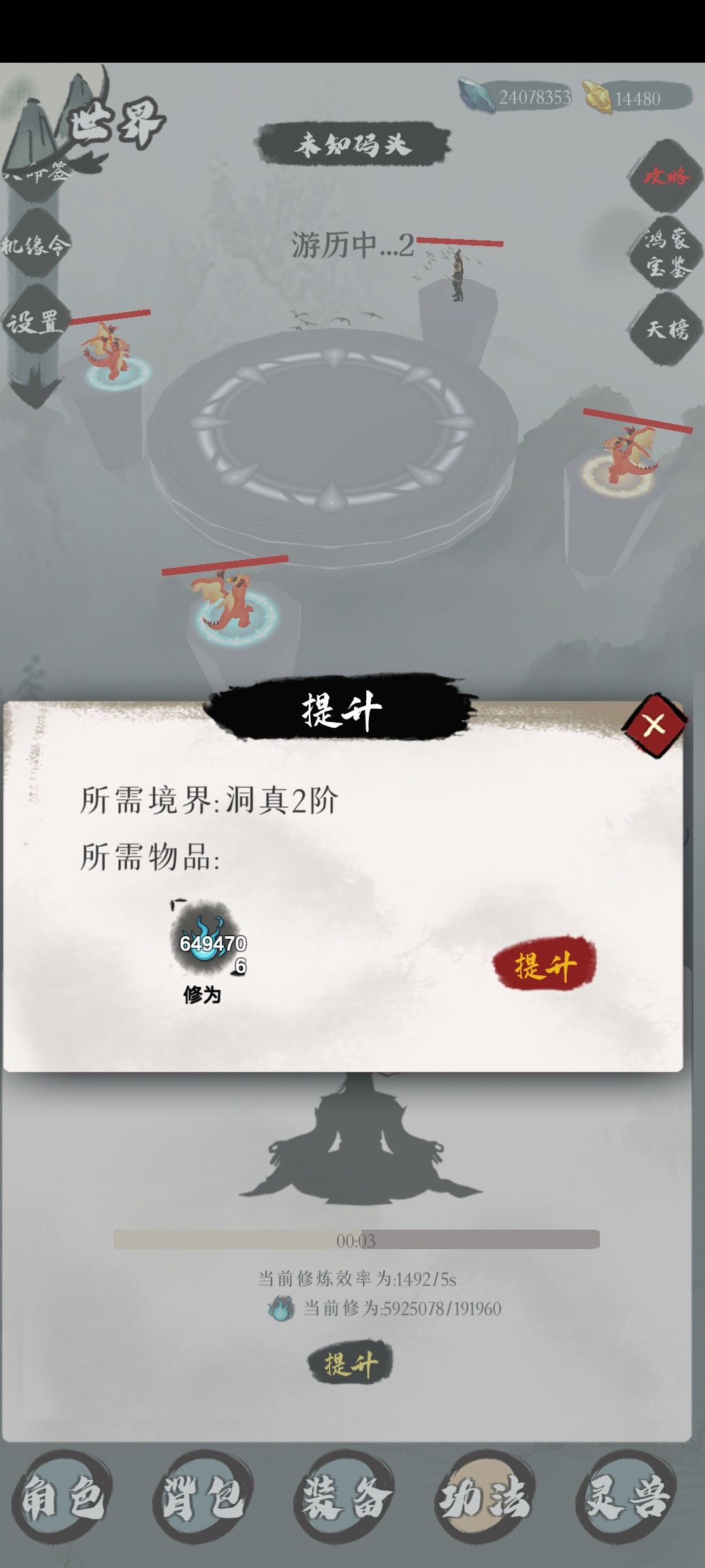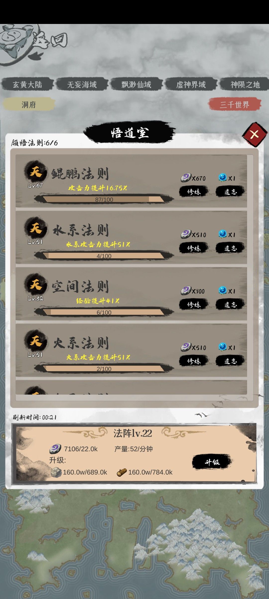 产出三种升级药园,悟道室和器灵的资源,升级后可以提高每分钟产出数量和储存上限,这个优先升级悟道室,药园和器灵大致升级一下就行了(悟道室需要分神开启)。