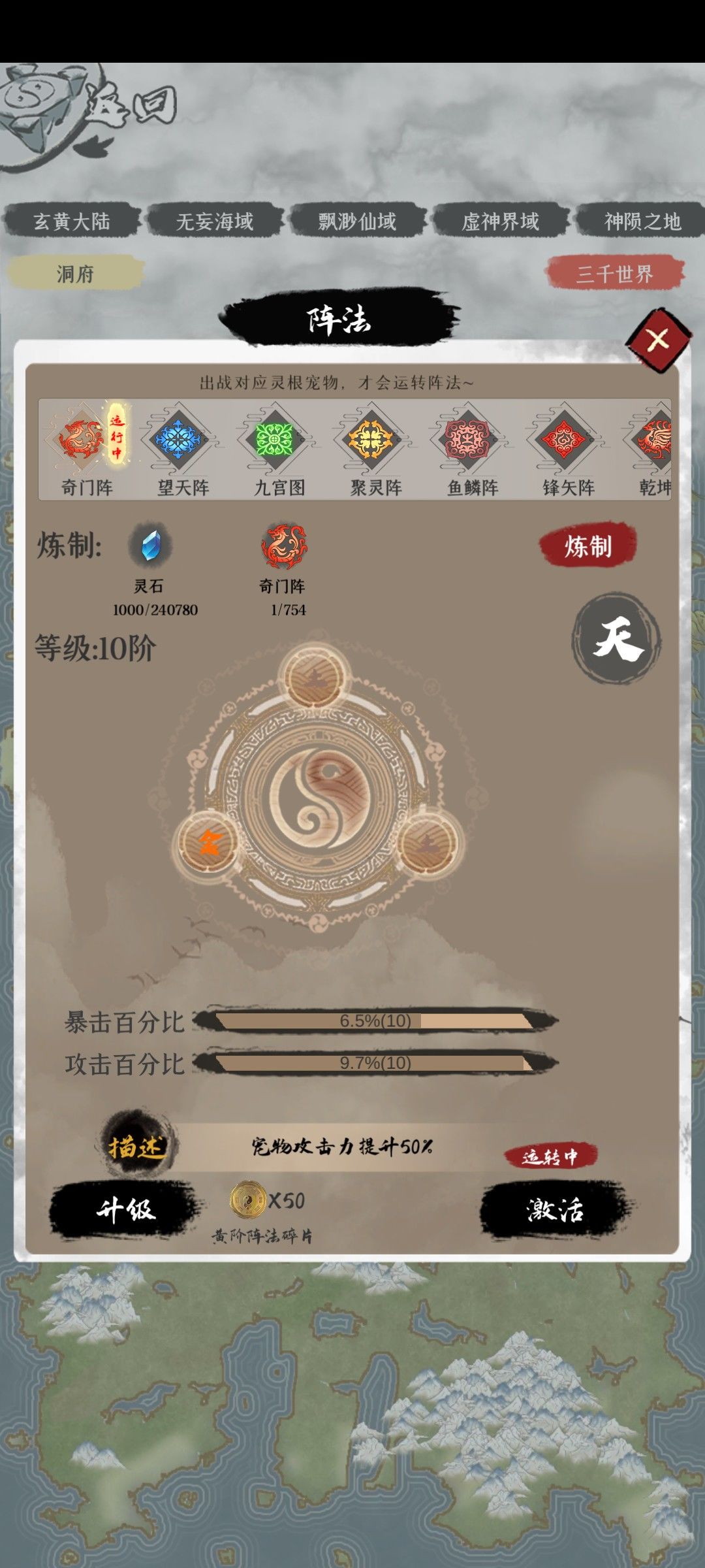 宠物专用,每个阵法有不同的效果,宠物想要启用阵法需要对应五行,阵法需要阵法碎片升级,升级后效果提升,碎片可以靠万物抽奖获取,另外下面词条需要本阵法刷新(非常看脸)所以想要一个词条好且五行对的上的有一定难度