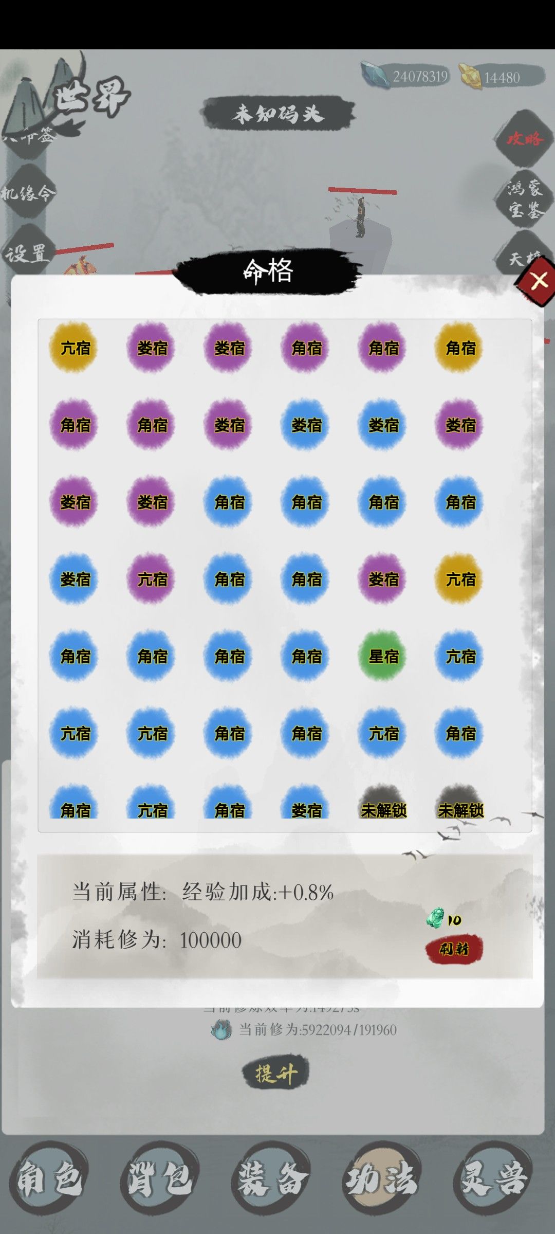 命格分为灰,蓝,紫,橙四个品质,需要命格石加修为开启,属性不理想可以刷新,命格石挂机,万物,试炼塔都可以获取,一个小境界加一个开启上限