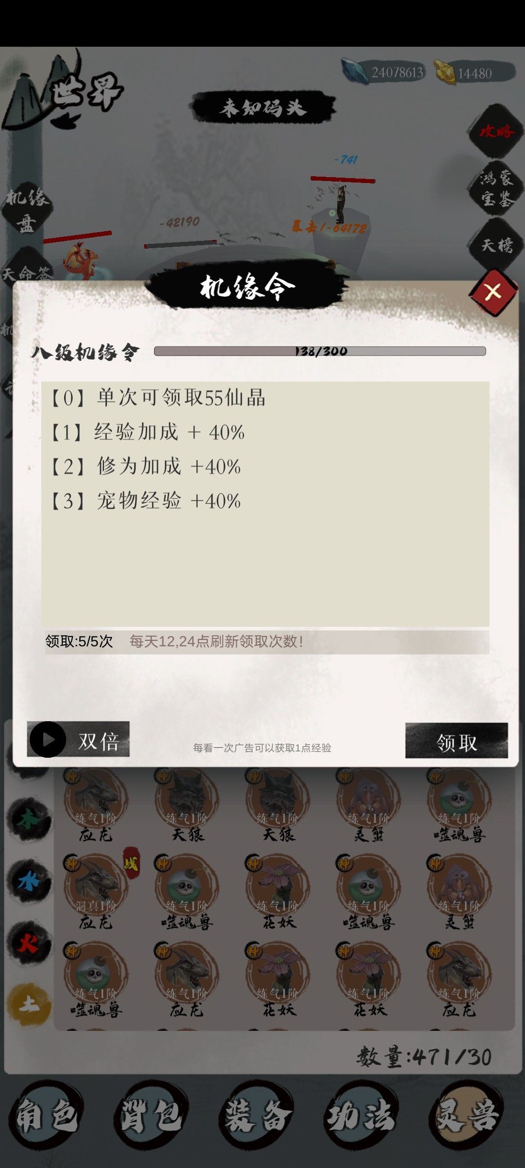 升级后有加成可以算作一个神通看广告可以获得双倍仙晶奖励,看双倍仙晶广告和每日送的广告唤灵,万物抽奖可以获得经验,一天30点经验,每天凌晨0点和中午12点各刷新一次