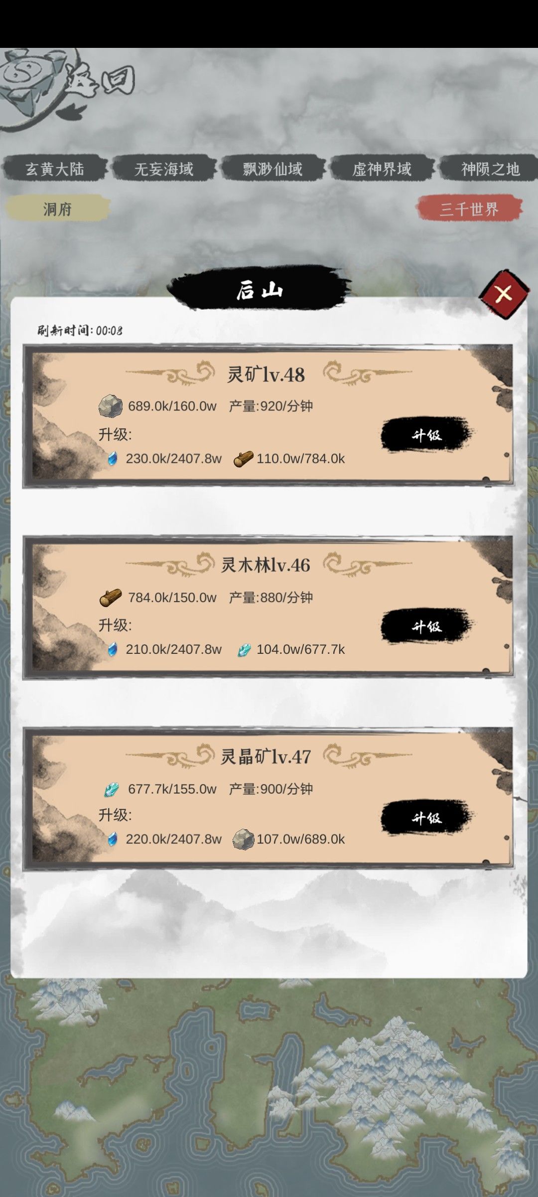 产出草药的地方可以升级(升级需要后山产出的资源)增加每分钟产量和储存上限(等级不需要太高够用即可)