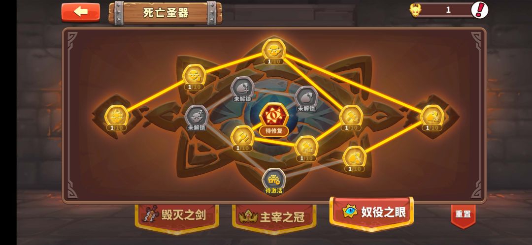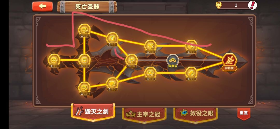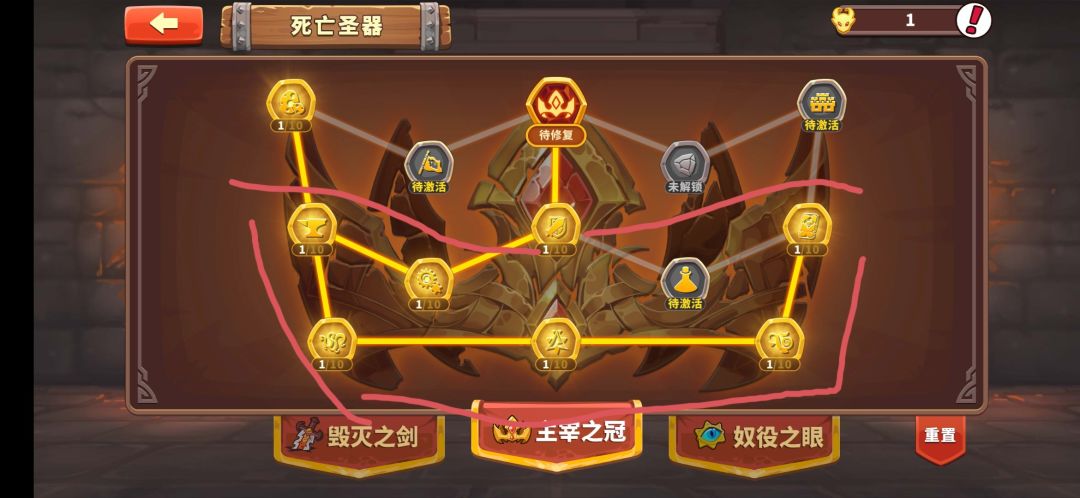 这个建议在点完基础第一第三分支后再升级此界面。这个界面都是增加采集效率的,个人建议前期没必要点,因为资源差距不大。(因为你没有黑工哈哈⌓‿⌓)除了右上那3个跟采集效率无关其他都有关联,对于萌新建议把魔金沙漏从最开始一直攒到推完图结束,然后把此界面点完会增加20%的收益。使用完沙漏后直接重置。(小声说一下圣器重置卷建议攒上5-6个这个对于百倍,清理魔金沙漏来说很总要。)