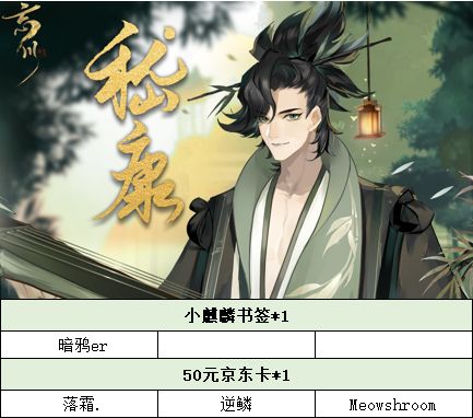 请以上获奖的各位使君大人尽快添加QQ:3391142247(忘川小麒麟)进行登记,超过七个工作日则视为自动放弃奖励了哟!