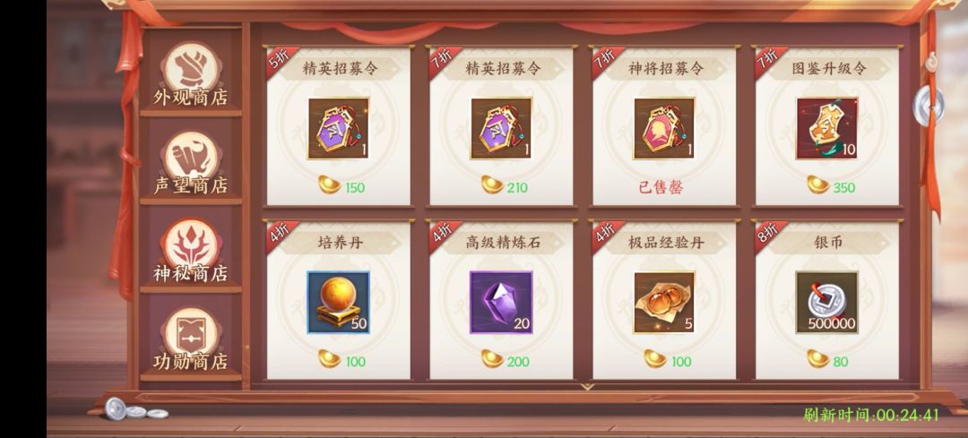 小白小资应该存元宝,所以商店买打折的,7天前可以买一些精英招募牌子,后面就不买了,只买神将牌子和少许图鉴牌子(图鉴升级等级越高加的战力越高,后面升一级加可以加十几二十几w)。装备商店可以把精炼石头买满,一星期刷新一次。宝物搜寻,副本打的越多,东西越多,自己斟酌!7天目标里面也可以买5折东西,神将牌子,万能碎片,图鉴买!!!