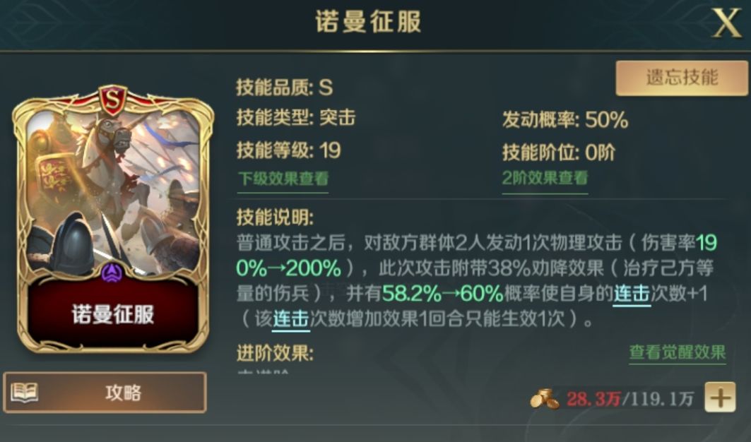 锁定伤害技能,根据携带者突击技能命中的单位,再次对该单位造成伤害,并且带有劝降效果,能很大程度降低战损。