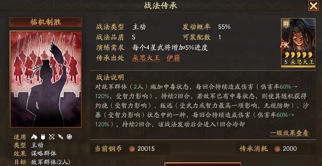 新战法“临机制胜”介绍:“对敌军群体( 2人)施加中毒状态,每回合持续造成伤害(伤害率60%→120%,