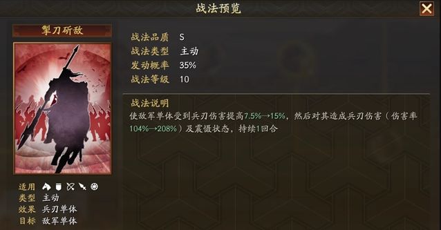 最后一个是新事件战法-魏延劫法场,可以兑换出“掣刀斫敌”战法,效果是:“使敌军单体受到的兵刃伤害提高15%,然后对敌人造成208%伤害并且震慑一回合。”只能说算是纵兵劫掠的升级版本吧,如果需要消耗例如关羽职业的核心武将的话就慎重兑换,不过用来搭配SP袁绍沮授的群弓阵容有一定的强度提升!
