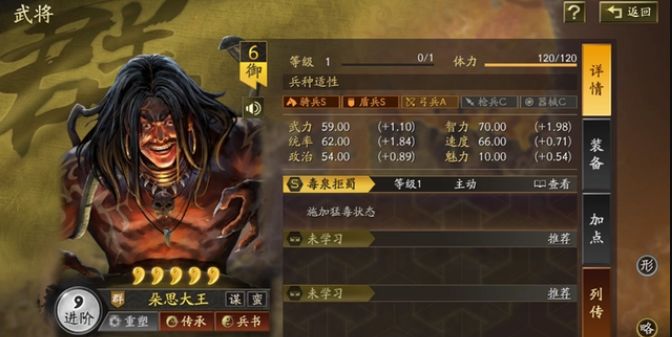 朵思大王面板属性基本上属于不达标,自带战法触发的“猛毒”实在是花里胡哨不用考虑,不过用来传承新战法“临机制胜”还是比较不错的。