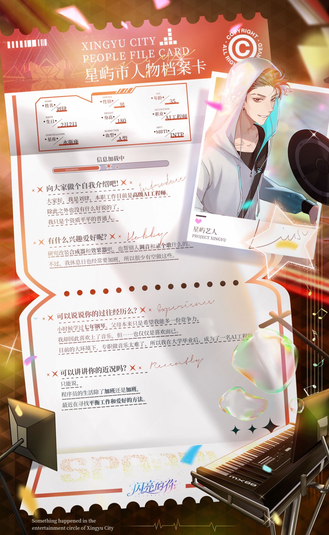 据小道消息透露,这名神秘成员八成就是阿兔科技公司的AI工程师——刘肆。听说这位有着音乐天赋的程序猿,在繁忙的工作之余,也会游走于各个餐吧的小型舞台,表演不逊色于整支乐队的键盘独奏……