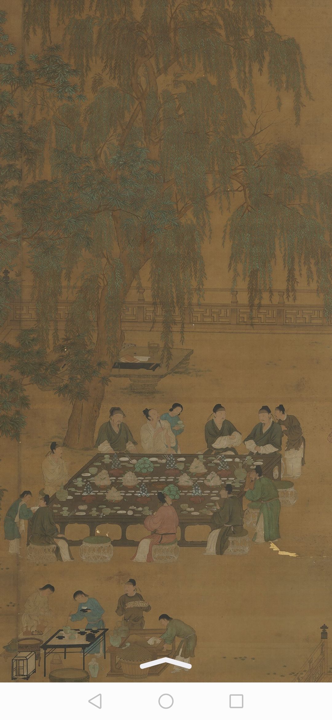 本幅描绘池边大树下,一群文士正据案饮宴。