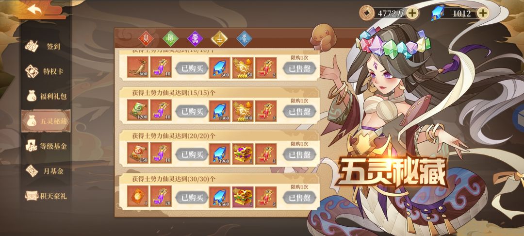 五行秘藏,新区前一周能够白嫖比较多的钻石,这里不推荐直接2000钻石抽仙灵,优先把五灵秘藏钻石能买的都买了,10抽加其他道具,而且比较实惠,就是得仙灵数量到达一定数量解锁,不过前几天每天都送很多召唤券,相信欧皇们肯定能嘎嘎出货