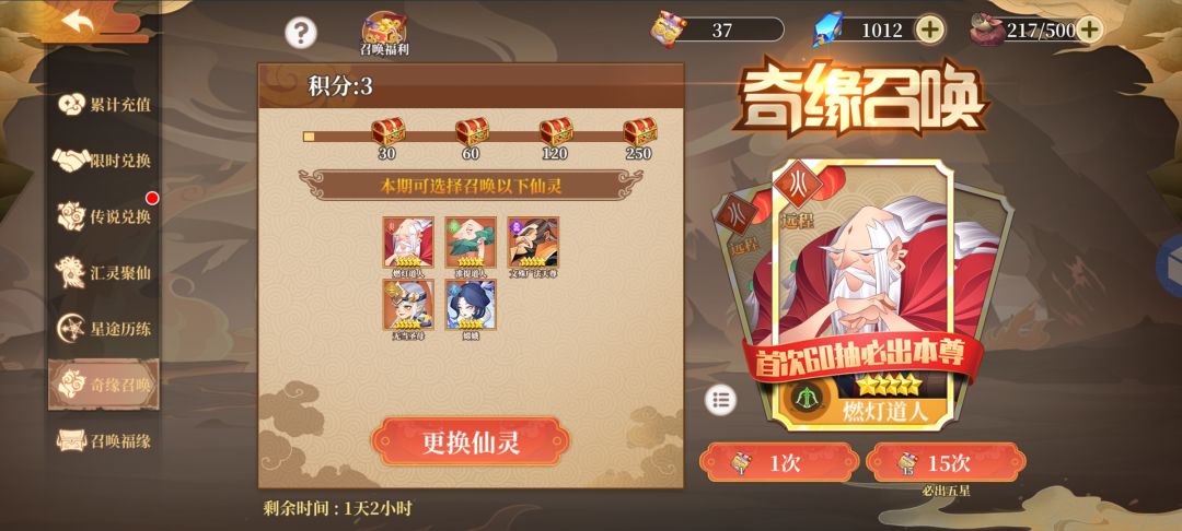 仙灵试炼会送比较多的限时券,这里建议存满250张抽一次(会有一个15资质资源箱子),如果着急要本体的话建议存满120抽,60抽必出一个自选仙灵,120抽有一个14资质资源箱子,3000钻石15抽
