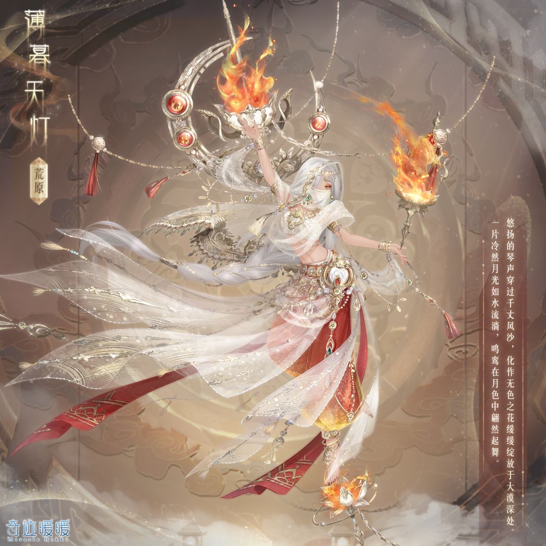 【薄暮天灯】含默认肤色及深色肤色的特殊姿势,全新妆容“云霄将早”、“灼灼盛年”,赤焰面饰“簌簌鸣风”,精美可移动摆件“炎焰昭昭”、“莲生流景”、“灵明莲火”。