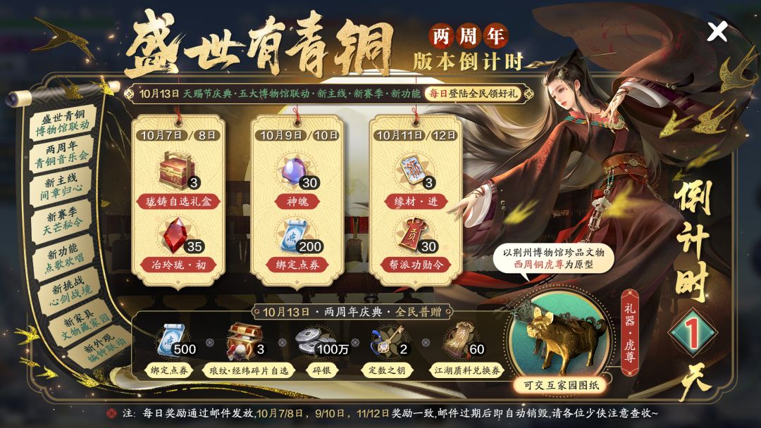 注意注意!全新资料片【盛世有青铜】暨刀刀二周年盛典今日上线!少侠们准备好了吗?别忘记今日上线领取签到奖励哟~